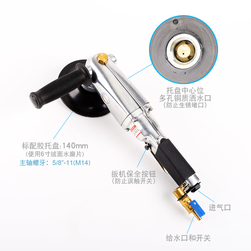• 產(chǎn)品參數(shù): 托盤尺寸:140mm(M14螺牙);使用磨片:140mm或150mm;轉(zhuǎn)速:7000rpm;長(zhǎng)度:430mm;重量:3.2kg;功率:0.93hp;耗氣量:1.15立方米/分鐘;使用工作氣壓:0.63Mpa;推薦氣管內(nèi)徑13mm;平時(shí)使用應(yīng)多加氣動(dòng)油保養(yǎng)
