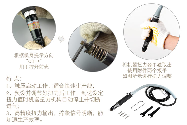 本機(jī)為觸壓?jiǎn)?dòng)式,內(nèi)調(diào)扭力,自動(dòng)斷氣式。