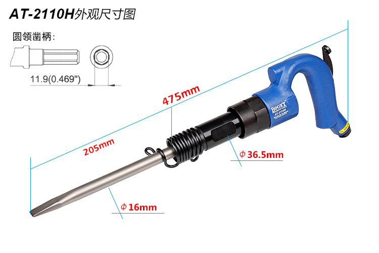 • 產(chǎn)品參數(shù): 鎬尖尺寸:H11.9*250L*20W 【標(biāo)配/扁鎬頭】 活塞直徑:20*48mm 活塞沖程:58mm 打 擊 數(shù):3000bpm 帶鎬全長:475mm 含鎬重量:2.16kg (含鎬頭) 耗 氣 量:7.4cfm 【六角柄】