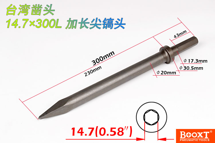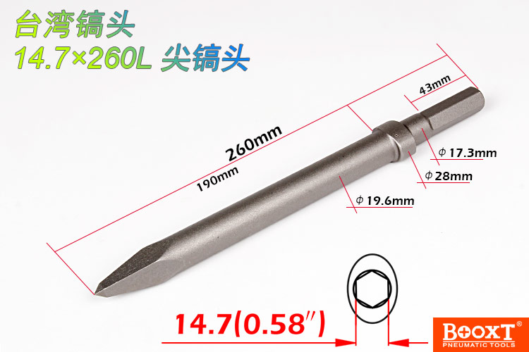 • 產品參數: 鎬頭尺寸:H14.7*260L*25W 【標配:扁鎬頭】 活塞直徑:28.5*67mm 活塞沖程:73mm 打 擊 數:2300bpm 帶鎬全長:540mm 含鎬重量:8.70kg 【六角柄】