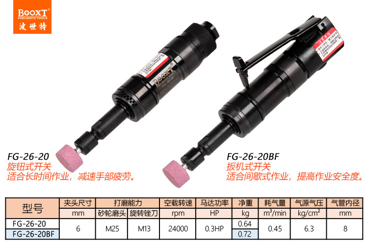 東莞市強(qiáng)勁五金工具有限公司提供臺(tái)灣BOOXT波世特品牌氣動(dòng)工具,風(fēng)磨機(jī)FG-26-20廠家直銷,首件享特價(jià)。咨詢熱線:4008301980